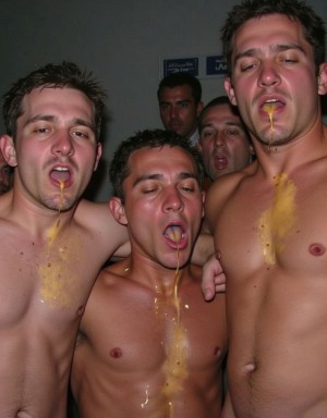 Jugador de rugby ha hecho mal partido y es empujado al suelo y recibe esputos y semen de sus dos compañeros como castigo. Se hallan en el vestuario