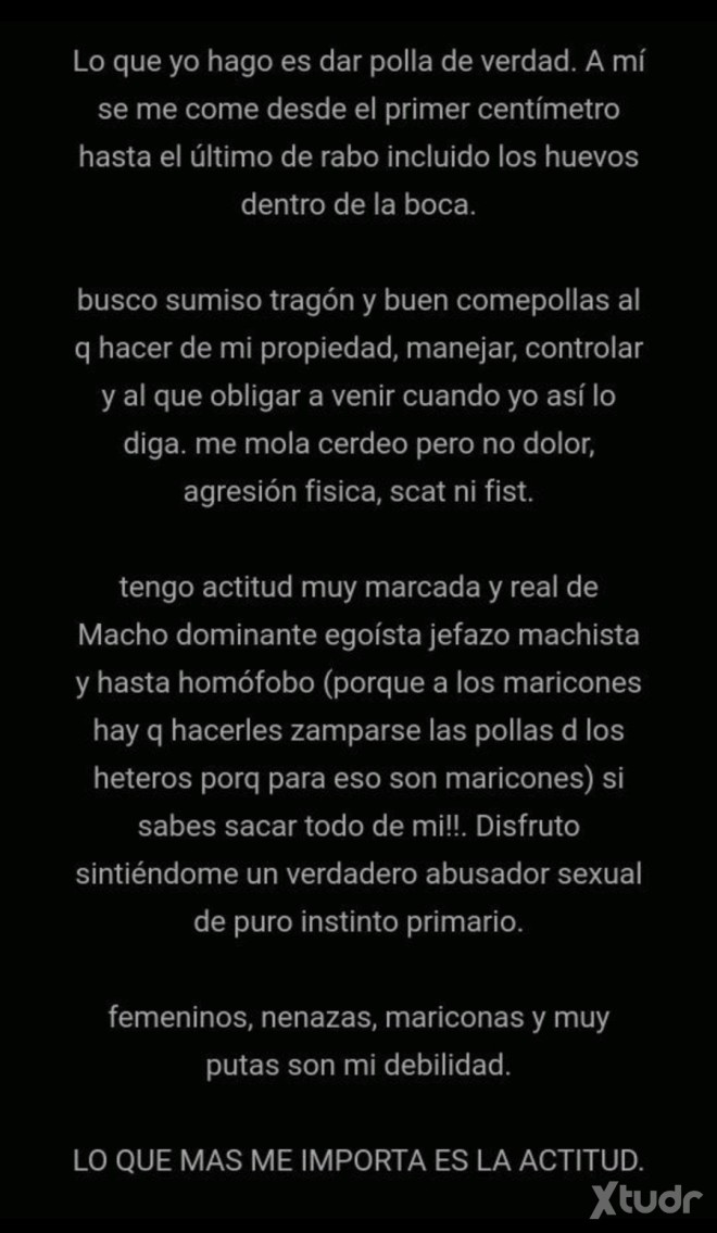 Soy un tio heterosexual real y genuino. Difícil vas a dar con otro igual. Soy Dominante, controlador, jefazo, abusador, egoísta... pero siempre depende de tu actitud, gustos y límites. Yo soy así de condición, no interpreto un papel ni voy con guión, yo soy el tio que sepas sacar de mi, y repito "siempre depende de tu actitud". Puedo ser agresivo, pero no soy alguien que le de placer causar dolor o sufrimiento, disfruto humillando, inmovilizando, tapando ojos y juegos kinki. PARA MI NO EXISTEN LAS POLLAS BUSCO ACTITUD y no cumplir tus fantasías... Soy una buena opción para novatos que quieren iniciarse en la garganta profunda. Hasta aquí me explico, el resto lo dejo para ir conversando de forma más privada.